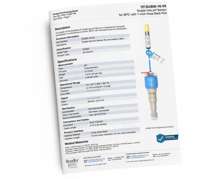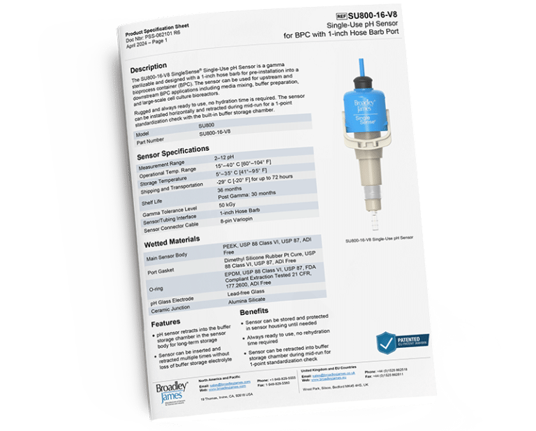 The SU800-16 SingleSense® Single-Use pH Sensor is gamma sterilisable and designed with a 1-inch hose barb for preinstallation into a bioprocess container (BPC). The sensor can be used for upstream and downstream BPC applications including media mixing, buffer preparation, and large-scale cell culture bioreactors.